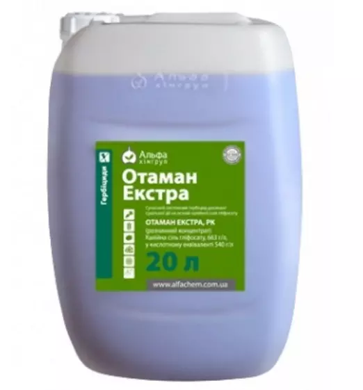 Гербицид Атаман Экстра от производителя АльфаХимгрупп с действующим веществом Калийная соль глифосата - 663 г / л, в кислотном эквиваленте - 540 г / л для зерновых, пшеницы, кукурузы, сои, гороха, льна можете купить, заказав на нашем сайте по выгодной цене с доставкой в любую току Украины.